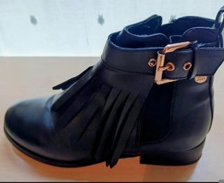 Botines de la marca XTI en color negro. Un diseño moderno y llamativo. - Detalle de flecos en el lateral. - Cierre de cremallera. - Hebilla decorativa en el tobillo.