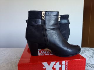 Botines negros de la marca Xti, talla 37, completamente nuevos. - Diseño moderno y elegante. - Cierre lateral con cremallera. - Tacón cómodo para el día a día.