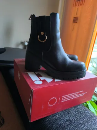 Botines de la marca XTI en talla 36. Han sido usados una sola vez y se encuentran en perfecto estado. - Diseño moderno con detalle de aro dorado. - Suela de plataforma gruesa.