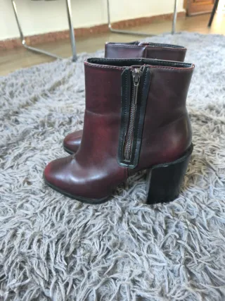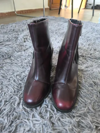 Botines de Zara Trafaluc en color burdeos-granate, talla 40. Tacón ancho muy cómodo y cremallera lateral decorativa. ✔ Tacón estable (ideal para caminar) 7cm ✔ Diseño recto estilo años 70 ✔ Color burdeos fácil de combinar ✔ Ajustan bien al tobillo Estado: usados, con marcas de uso visibles en laterales (se ven en fotos). No afectan al uso. Suela en buen estado. Perfectos para darles una segunda vida o para looks casuales con vaqueros. Si necesitas fotos extra o medidas, te las envío encantada. 🤎