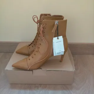 Botines de Zara con un diseño elegante y moderno, nuevos. - Cordones decorativos y cierre con cremallera lateral. - Talla 37 - Punta fina. - Tacón fino de 6.5cm - Color: Caramelo - Material: Piel Precio Zara: 69.95e