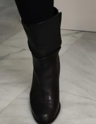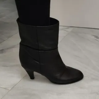 Botines de caña media con detalle elástico. - Material exterior poli piel - Tacón grueso. - Punta redonda. Son super comodos Y se adaptan muy bien a la pierna Tienen uso pero todavia estan bien Talla 39