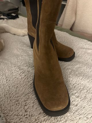 Botas de Zara en piel auténtica. Tejido ante. Color caqui. Tacón de 7.5 cm. Y altura total de la bota de 27 cm. Talla 37. Usadas 2 veces. Están nuevas, sin desperfectos. En tendencia.