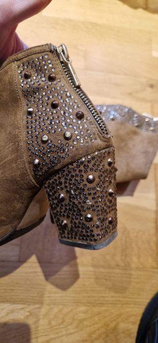 Botines de tacón con un diseño llamativo y detalles metálicos. - Material exterior tipo ante. - Puntera reforzada con tachuelas y pedrería. - Cierre lateral con cremallera dorada.