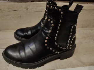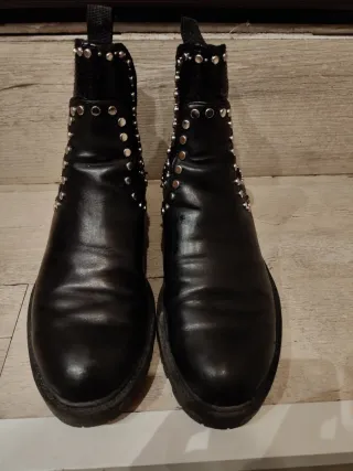 Botines de estilo motero de Zara. Son cómodos y versátiles para el día a día. - Diseño con tachuelas plateadas. - Paneles elásticos laterales. - Tirador trasero para facilitar su puesta. Talla 37 , muy buen estado