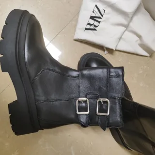 Botines de estilo motero de la marca Zara. - Diseño en piel. - Cierre con doble hebilla metálica. - Suela gruesa y dentada.