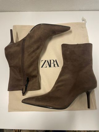 Botines de tacón de Zara, sin estrenar. El color es marrón y la talla es 37. - Tacón alto y fino. - Material tipo ante. - Cierre de cremallera en la parte trasera.