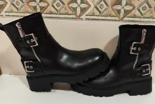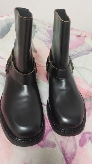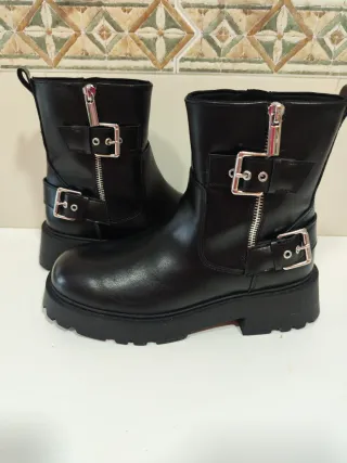 Botines de estilo motero con detalles metálicos. Casi nuevo, se usado solo 1 día. Me equivoqué de talla - Cierre de cremallera. - Dos hebillas decorativas. - Suela gruesa y resistente.