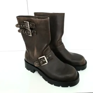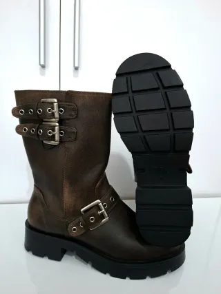 Botas de estilo motero de Zara en color marrón. Cuentan con un diseño moderno y detalles metálicos. - Cierre con hebillas ajustables. - Suela gruesa y resistente. - Caña media.