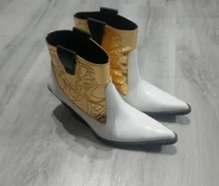 Botines estilo cowboy con un diseño llamativo. - Combinación de blanco y dorado. - Detalle de bordado en la caña. - Punta afilada. - Tacón curvo. Botines estilo cowboy con un diseño llamativo. - Combinación de blanco y dorado. - Detalle de bordado en la parte dorada. - Tacón negro angulartiene un desperfecto en el tacón por la parte interna de haberlo usado pero no se aprecia prácticamente