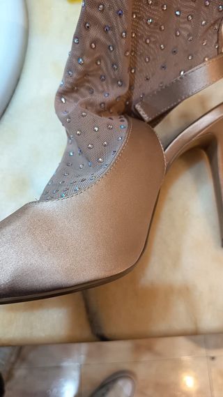 Elegantes botines de Zara en color dorado, adornados con pequeñas joyas. - Diseño tipo botín con abertura. - Acabado satinado. - Detalle de pedrería. - Tacón alto y fino.