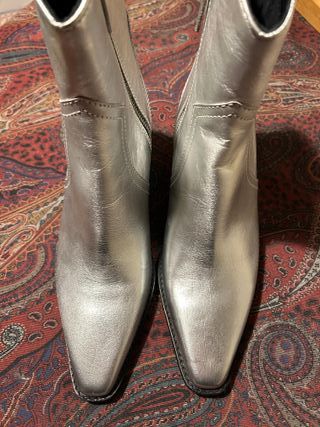 Botines de piel en color plateado, sin estrenar. - Diseño de punta afilada. - Tacón de aguja. - Cierre de cremallera lateral.