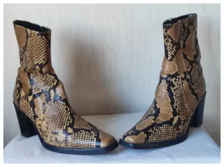 Botines de Zara con un llamativo estampado efecto piel de serpiente. Num. 35 (21cm) Altura tacón 8,5 cm - Diseño de caña alta. - Punta cuadrada. - Cierre de cremallera lateral.