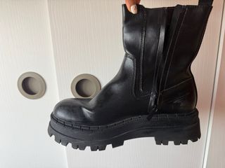 Botines de Zara en color negro, talla 39. Se han usado muy poco. - Diseño tipo calcetín canalé. - Suela track con plataforma y tacón grueso. - Cierre con cremallera y detalle metálico en la parte trasera.