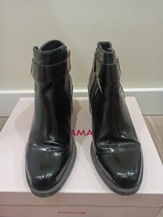 Botines de charol en color azul oscuro. Tienen un diseño elegante y moderno. Marca 42 pero es como un 41. - Tacón grueso redondo. - Cierre de cremallera lateral.