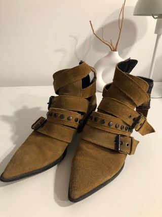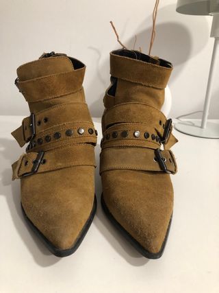 Botines de piel de serraje con un diseño moderno y atrevido. Zara. Muy cómodos. Usado poco, como nuevos. - Cierre con cremallera. - Detalles con hebillas metálicas y tachuelas. - Puntera afilada.