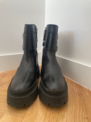 Botines de la marca Zara con un diseño moderno y detalles de hebillas. - Cierre con cremallera lateral. - Tres correas con hebillas metálicas. - Suela gruesa y resistente.