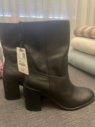 Botines de piel negros de Zara, nuevos sin estrenar. - Material exterior: Piel. - Cierre: Cremallera. - Tacón: Bloque. - Altura del tacón: 8 cm aprox. - Caña: Media.
