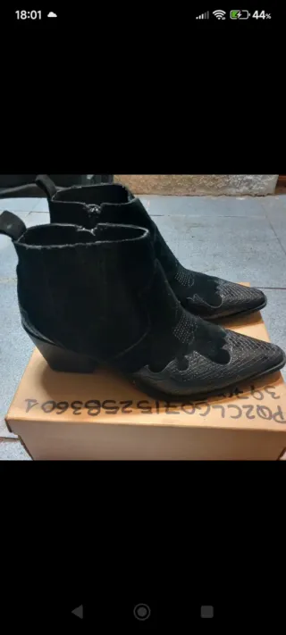 Botines de estilo cowboy en color negro. - Material exterior: serraje y polipiel. - Detalle de puntera con diseño. - Tacón con forma. No los he usado mucho.