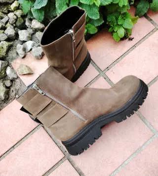 Botines en perfecto estado. Son tobilleros, estilo chunky y suela track de goma para un mejor agarre. El exterior de piel vuelta (serraje/suède) de buena calidad. La suela está intacta. Tiene un cierre con cremallera lateral interior para que sean fáciles de poner. Panel elástico lateral clásico de las botas Chelsea. Son perfectos para combinar con jeans, leggings o incluso vestidos. Dales una oportunidad 🖤