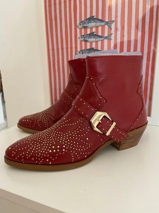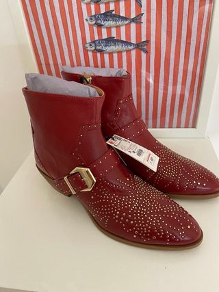 Botines de piel,rojos. - Piel suave al tacto. - Adornados con tachuelas metálicas doradas. - Hebilla lateral. - Tacón de bloque de 4 cm muy cómodo. Talla 42. Usados 1 vez para un rodaje. En perfecto estado.