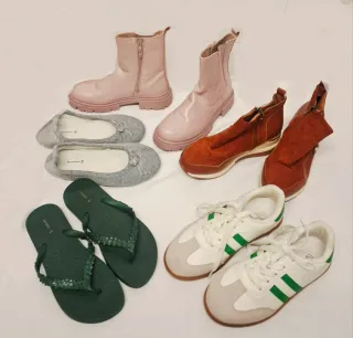 Lote de calzado variado para chica en talla 36. Incluye botas rosas, zapatillas de estar por casa grises, chanclas verdes y zapatillas deportivas blancas con detalles verdes. - Botas rosas con cremallera marca Zara - Zapatillas de estar por casa grises con lazo. - Chanclas verdes con adornos. Marca Oysho - Zapatillas deportivas blancas con franjas verdes marcan 37 es talla pequeña -Botines marrones con cremallera Todos están en buen estado Se hacen envíos y lotes preguntar sin compromiso Se entrega en mano en Barakaldo