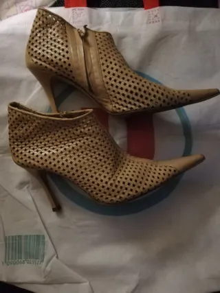 Tiene un roce en la puntera delantera y en la parte trasera de conducir. (ver fotos 3y 4.) Son pequeños para su talla equivalen a una talla 39. Elegantes botines de piel con un diseño calado y tacón fino. - Material: Piel - Color: Beige - Diseño calado - Tacón alto