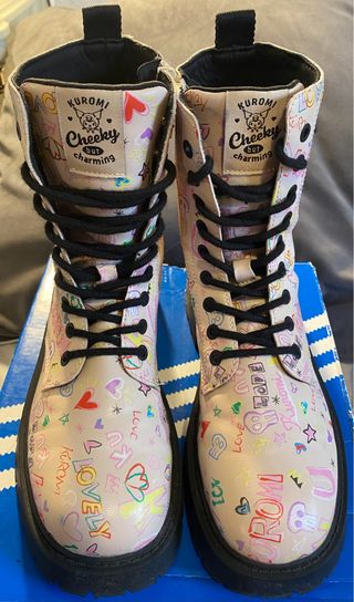 Botas de caña alta con un divertido estampado de Kuromi y corazones. - Diseño multicolor sobre fondo rosa. - Cierre y cordones negros. - Suela gruesa negra.