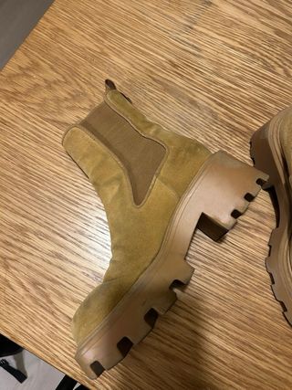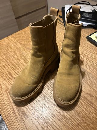 Botines estilo Chelsea de Zara. La suela estanperfecta solo que enmla zona de flexion del pie se ha levantado el tejido , no son de piel , de aho el precio pero creo q estan bien - Diseño elástico en los laterales. - Suela gruesa y dentada. - Tirador trasero para facilitar su puesta.