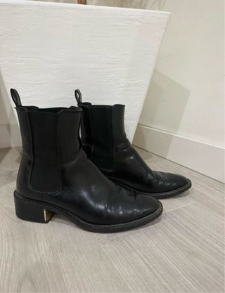 Botines de estilo Chelsea de Zara. - Material exterior de cuero. - Tacón bajo con detalle metálico dorado. - Diseño elástico en los laterales.