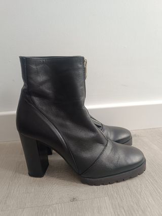 Botines Zara de piel auténtica (mucho más duraderos que la sintética o polipiel). Talla 41 9cm tacón Puestos en dos ocasiones (mido casi 1,80 y no me veo siendo la más alta allá donde vaya 😕) Impolutos Preciosos, perfectos para fondo de armario Costaron 99€