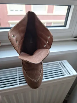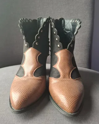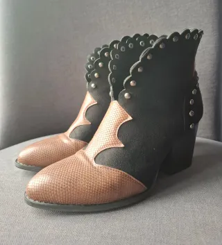 Botines estilo cowboy. Tacón medio y ancho, muy cómodo y estable. Punta ligeramente afilada que estiliza el pie, con detalles efecto serpiente. Parte superior en ante sintético suave. Tachuelas metálicas decorativas (le falta una; ver última foto). Suelas antideslizantes, como nuevas (puestas de una sola vez). Talla 38 muy fácil de poner, gracias a su estructura flexible. Altura del tacón 7,5 cm y altura total 20 cm. Ideales para llevar con pantalón o falda.