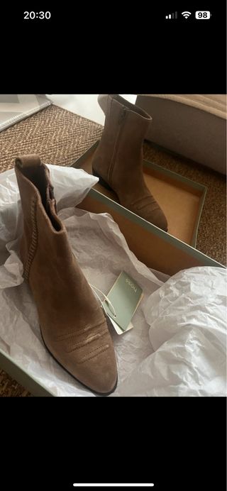 Botines de tacón de ante en color beige. - Diseño de punta fina. - Apertura lateral elástica. - Detalle de costuras en el empeine.compre un número más por que calza como un 41
