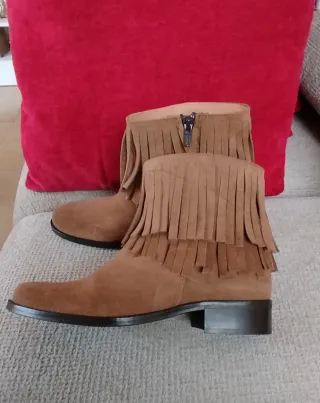 Botines de la marca Confetti, talla 36, totalmente nuevos (sin ningún uso). Son de color camel, estilo serraje, con flecos alrededor del tobillo que les dan un toque boho muy combinable. Llevan cremallera lateral para mayor comodidad y tienen un tacón bajito perfecto para el día a día. Ideales para looks de otoño/invierno, muy cómodos y de buena calidad.