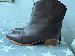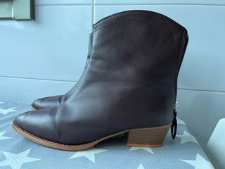 Botines de tacón bajo en color marrón. C - Tacón de madera. - Cierre de cremallera trasera. - Diseño tipo cowboy - completamente nuevos