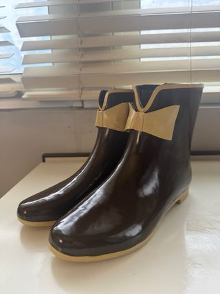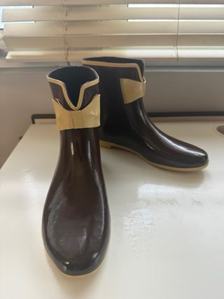 Botines de agua estilo katiuska en color marrón. Un calzado práctico y con un diseño moderno. - Material de goma. - Detalle de lazo de goma en color beige en la parte superior. Apenas uso, impermeables