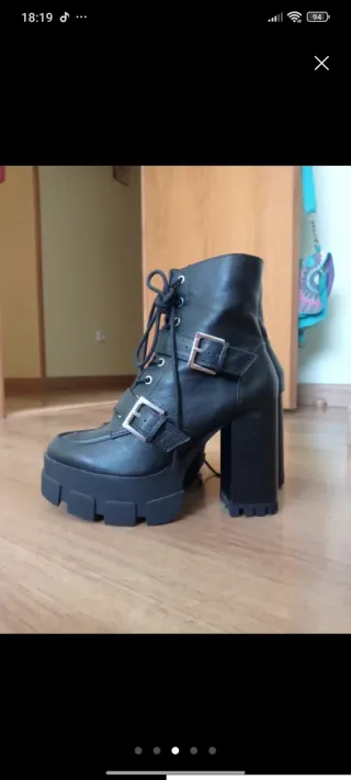 Botines negros con tacón de plataforma. - Tacón grueso y alto. - Plataforma delantera. - Cierre de cremallera lateral. - Estan nuevos 0 daños. - Son muy bonitos y quedan muy bien con todo. - Muy comodos y resistentes.