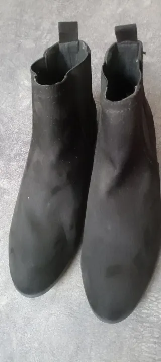 Botines de ante en color negro, talla 35. Un básico para cualquier armario. - Material exterior de ante. - Diseño tipo chelsea con elástico lateral. - Suela de goma. - Tacón bajo y cómodo.