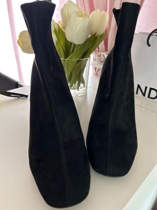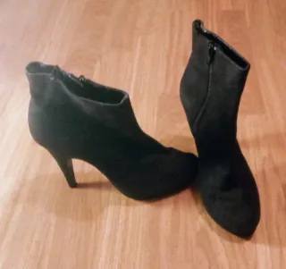 Botines de antelina en color negro, con un diseño elegante y moderno. Han sido usados solo dos veces, por lo que se encuentran en perfecto estado. * SOLO ENVÍOS * - Material: Antelina - Color: Negro - Estado: Como nuevos (dos puestas)