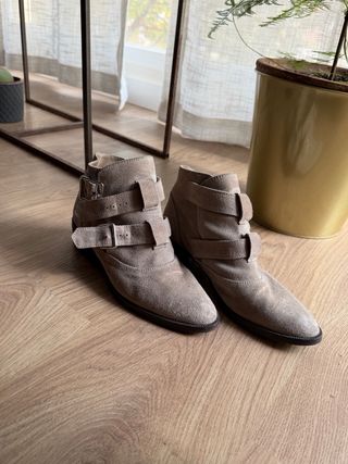 Botines de ante con detalles metálicos y hebilla. - Diseño con tachuelas. - Tacón bajo metálico. - Cierre lateral con cremallera. Se vende por que me quedan pequeños. al comprarlos me equivoque y no verifiqué la talla puestos solo 2 horas