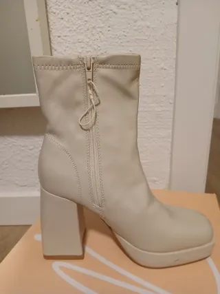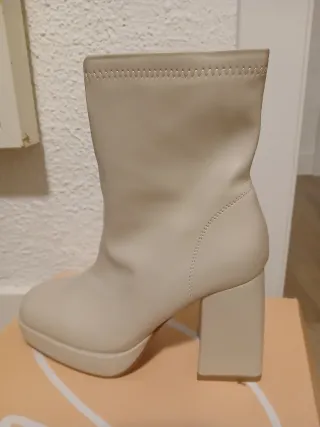 Botines de tacón con plataforma en color beige. - Diseño moderno y elegante. - Tacón cuadrado y robusto. - Plataforma delantera para mayor comodidad. - Material sintético de calidad. Usados una sola vez