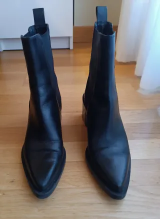 Botines de piel con un diseño muy elegante y moderno. Perfectos para añadir un toque sofisticado a tu look. - Material exterior e interior de piel. - Detalle de puntera en contraste. - Tacón cuadrado para mayor comodidad. - Cierre lateral con cremallera. Calidad del botin excelente. Pendiente de determinar la marca. Solo se ha usado 1 vez.