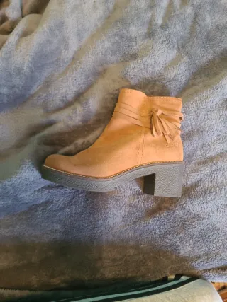 Botines de ante en color beige, con un diseño moderno y suela de plataforma. - Exterior de ante. - Forro interior suave. - Suela de plataforma gruesa. No tengo la caja original la tiré pensando que me las quedaría pero alfinal no, las he llevado un rato puestas por casa pero no termino de hacerme a ellas.