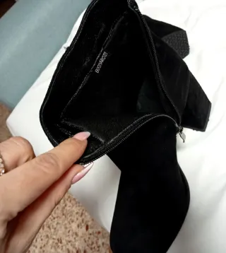 Botines de serraje con tacón alto. Utilizados solo en una cena Yo uso 39, pero ese modelo me venía mejor el 40, osea que talla como un 39 - Material exterior: serraje. - Color: negro. - Talla: 40.