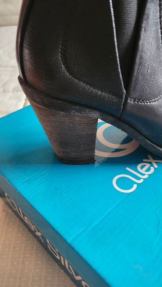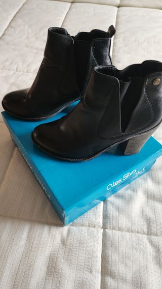Botines de tacón con un diseño moderno y versátil. - Material exterior de cuero. - Tacón grueso para mayor comodidad. - Detalle de elástico lateral para facilitar el calce.