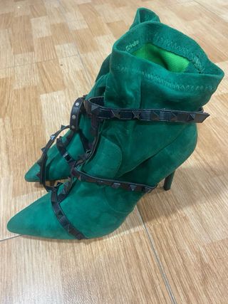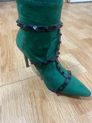 Botines de mujer con un diseño llamativo y moderno. - Color verde vibrante. - Adornados con tachuelas negras. - Tacón alto y fino. - Punta afilada. 2 pares 37 y 38