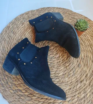 Botines de ante en color negro. - Tacón grueso. - Diseño elástico en la caña.