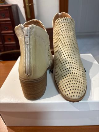 Botines de piel con un diseño moderno y elegante. - Material: Piel. - Color: Beige. - Diseño perforado. - Cierre de cremallera en la parte trasera. - Tacón de bloque. medidas del tacón : 6cm alto , ancho 5 cm y medio . envío por correos ordinario o certificado. no tengo cuenta en la app .