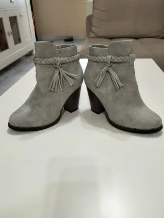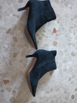 Usados en dos ocasiones, botines de tacón con un diseño elegante y moderno. - Material exterior de ante. - Cierre de cremallera lateral. - Tacón grueso y estable.