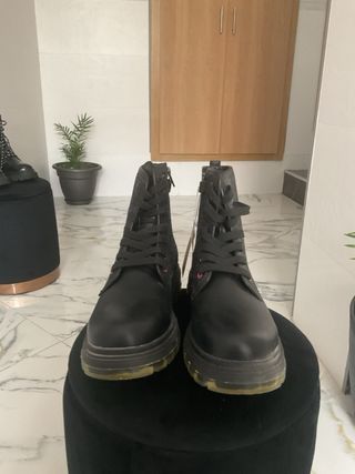 Botines negros con diseño tipo Martens. - Acabado texturizado. - Cierre de cremallera lateral. - Cordones decorativos.
